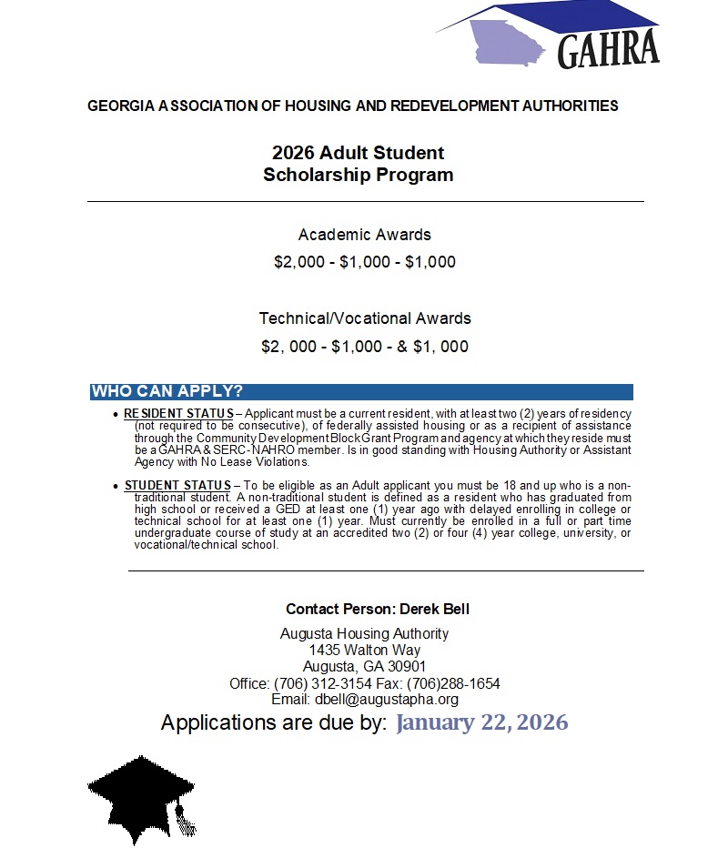The Augusta Housing Authority, in partnership with the Georgia Association of Redevelopment Authorities (GAHRA), is now accepting applications from Adult Students 18 and up, who is a non-traditional student. A non-traditional student is defined as a resident who has graduated from high school or received a GED at least one (1) year ago with delayed enrolling in college or technical school for at least one (1) year. Must currently be enrolled in a full or part time undergraduate course of study at an accredited two (2) or four (4) year college, university, or vocational/technical school.